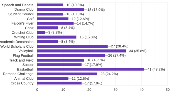 What are the most populated extracurriculars in Junior High? This is a question that I have had too. I sent out a survey to every class in Junior High to answer it. Keep in mind that not everyone answered. Only a little more than half (95 out of 182) of Junior High responded to the question. Some of the less populated extra curricular activities may not have been featured.